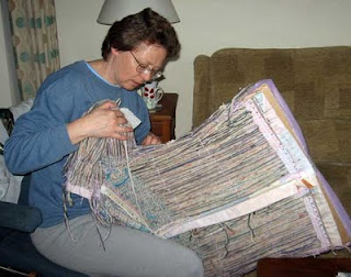 For my first attempt at creating a form to weave this tricky section I used Frieda the dressmaker's dummy. I dressed her in a denim jacket, put the loomskin over it and then stuffed the shoulders with stuffing from an old pillow. I then pulled the warp down firmly and tied it really tightly (with my husband's help) like a tourniquet at the waist and elbows. I began to weave, but it was impossible to get anywhere near the right tension with such a squishy form. I unpicked most of the rows and disassembled the form.